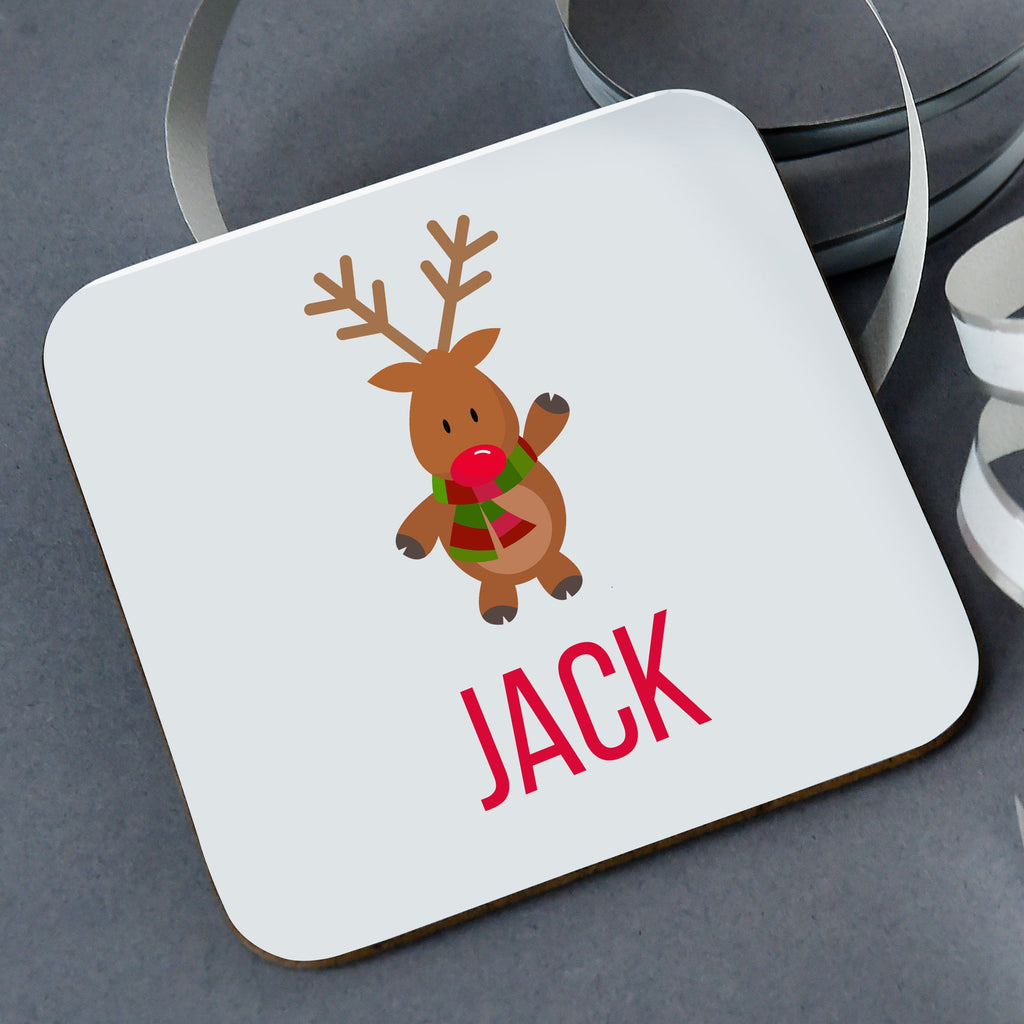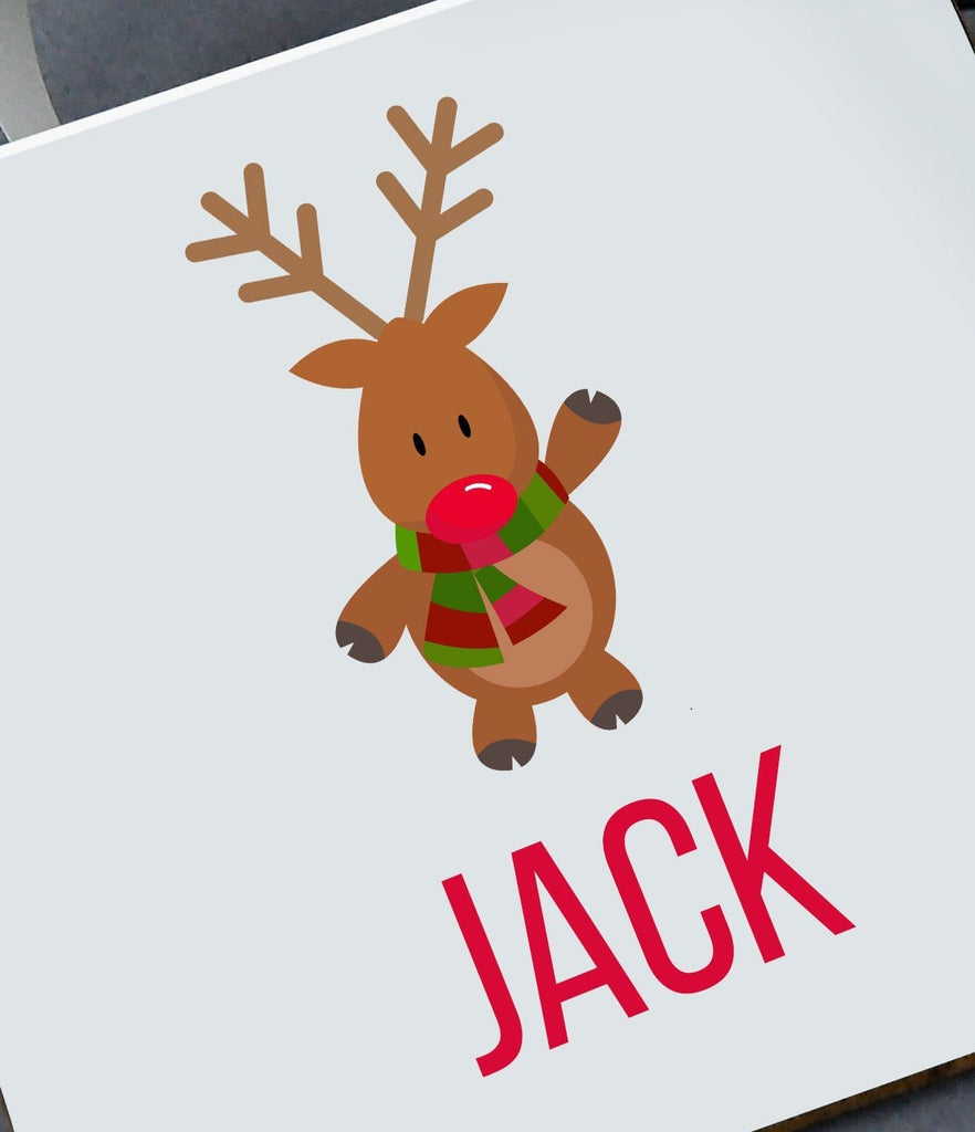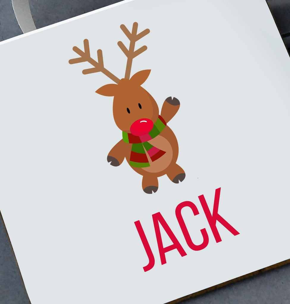 This Christmas Reindeer coaster is a gorgeous addition to your festive table. Printed on a white shiny base this coaster shows a cartoon reindeer with your name below in red.