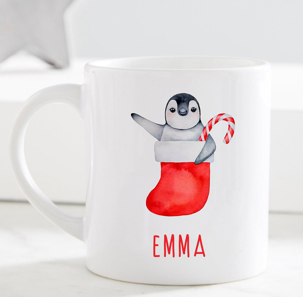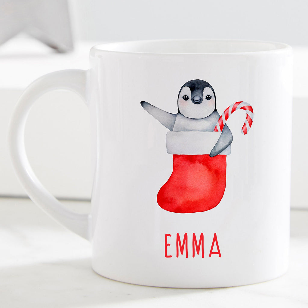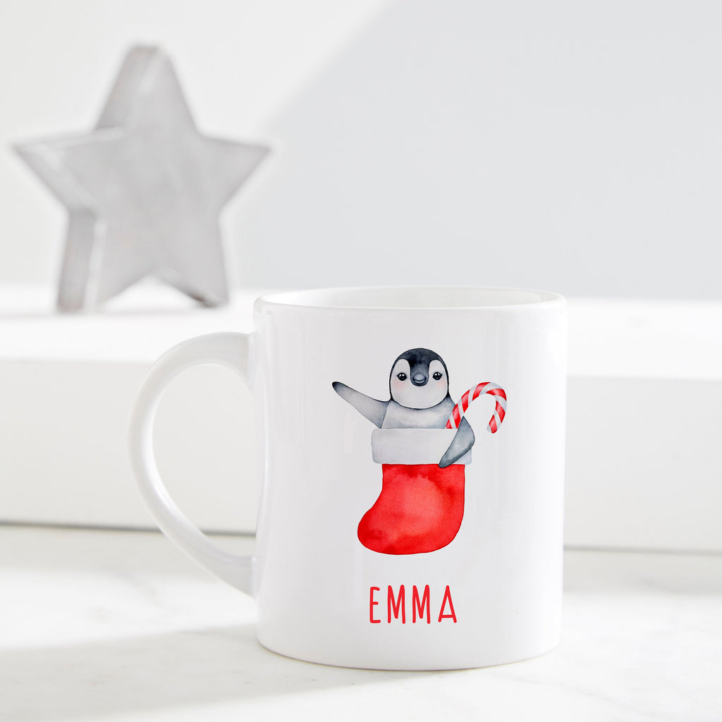This personalised ceramic mug features your chosen name along with a happy penguin in a Santa sack.