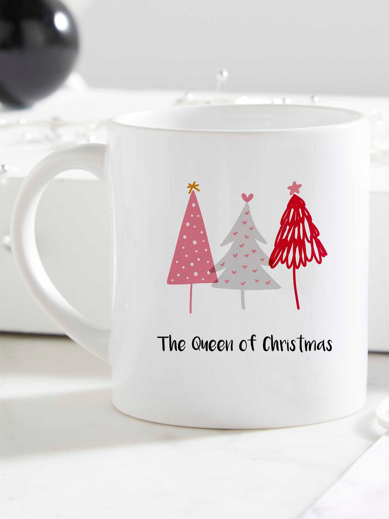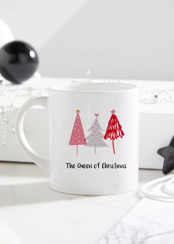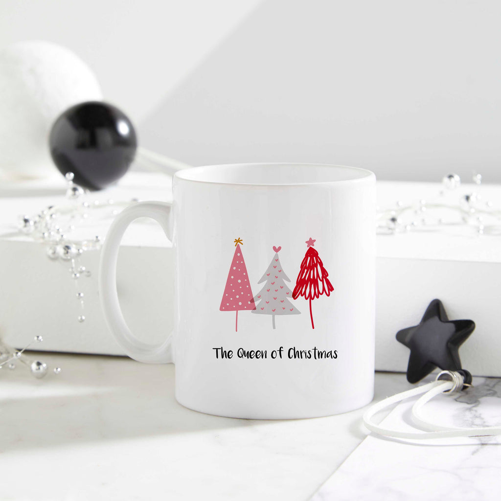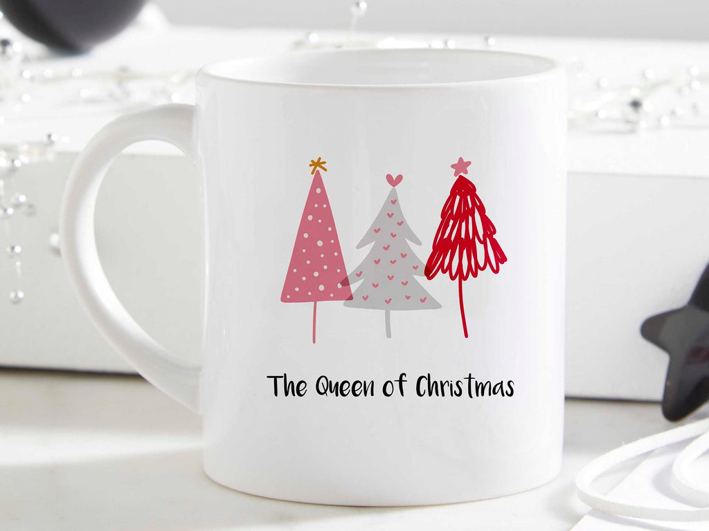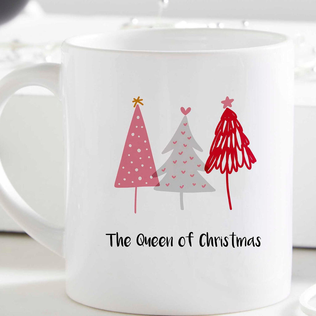 We all know 'that person' who loves Christmas. This mug is the perfect gift for them! The mu features three pink Christmas trees with the words Queen of Christmas below and the optional personalised name above.