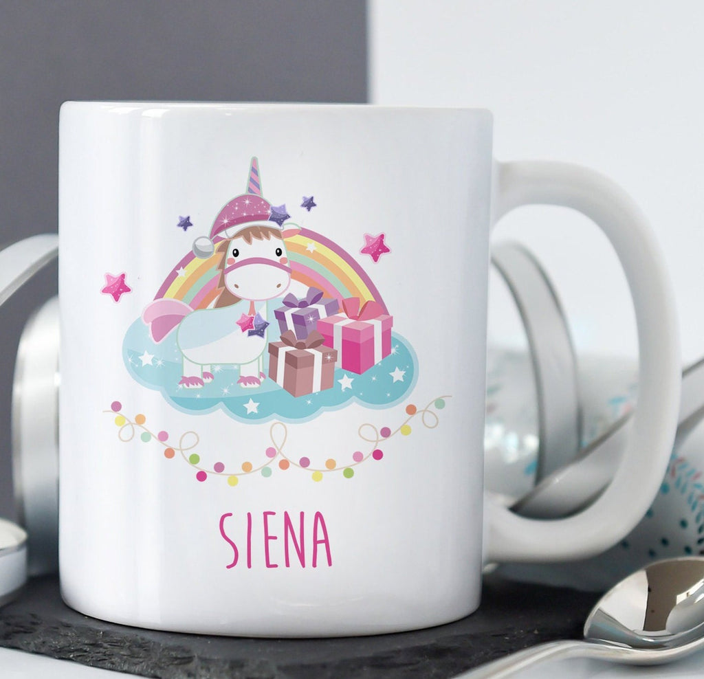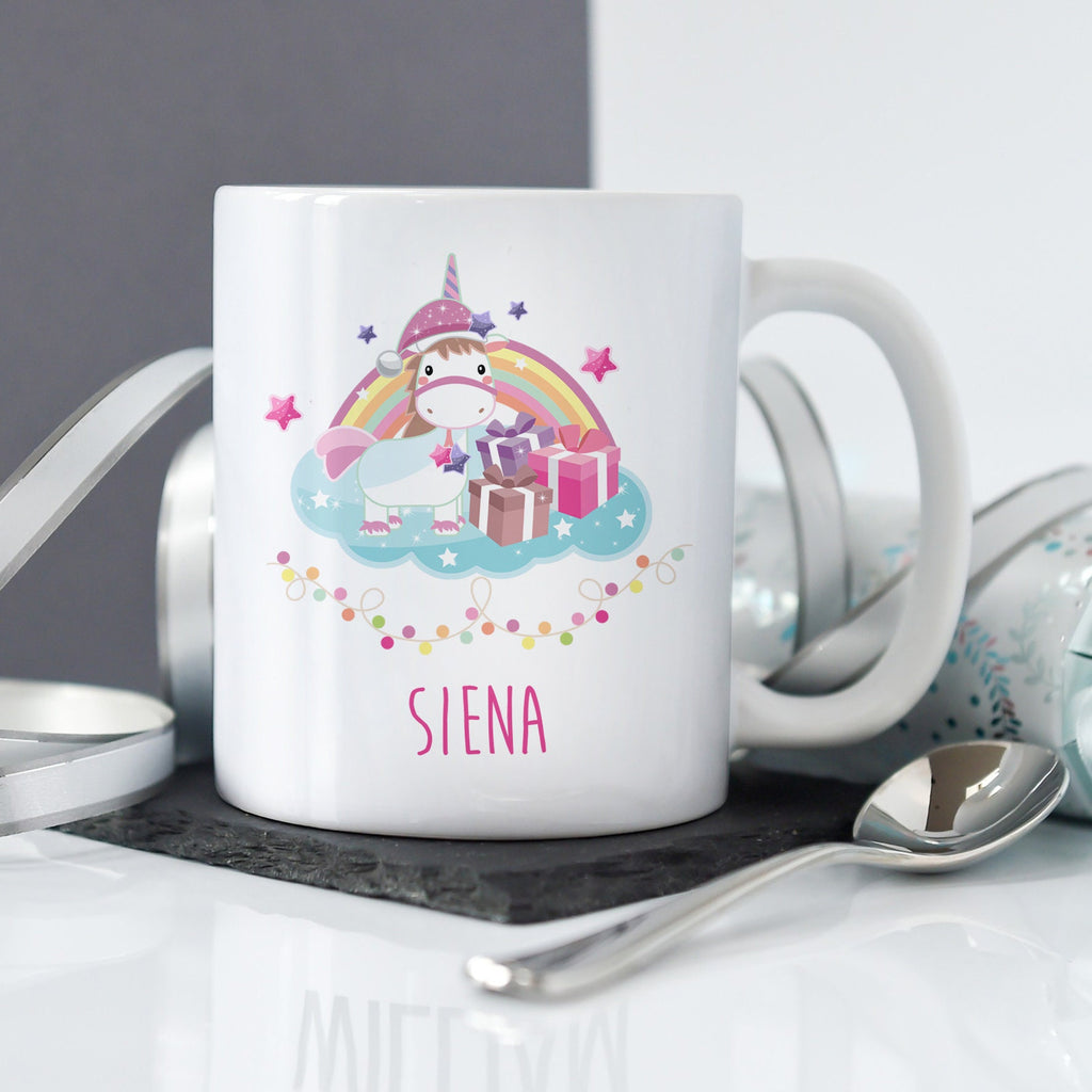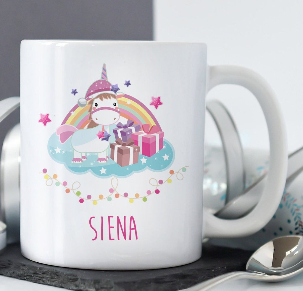 This personalised ceramic mug features a cute Unicorn surrounded by gifts. Sitting underneath the image is the name of your choice in a lovely bold font.