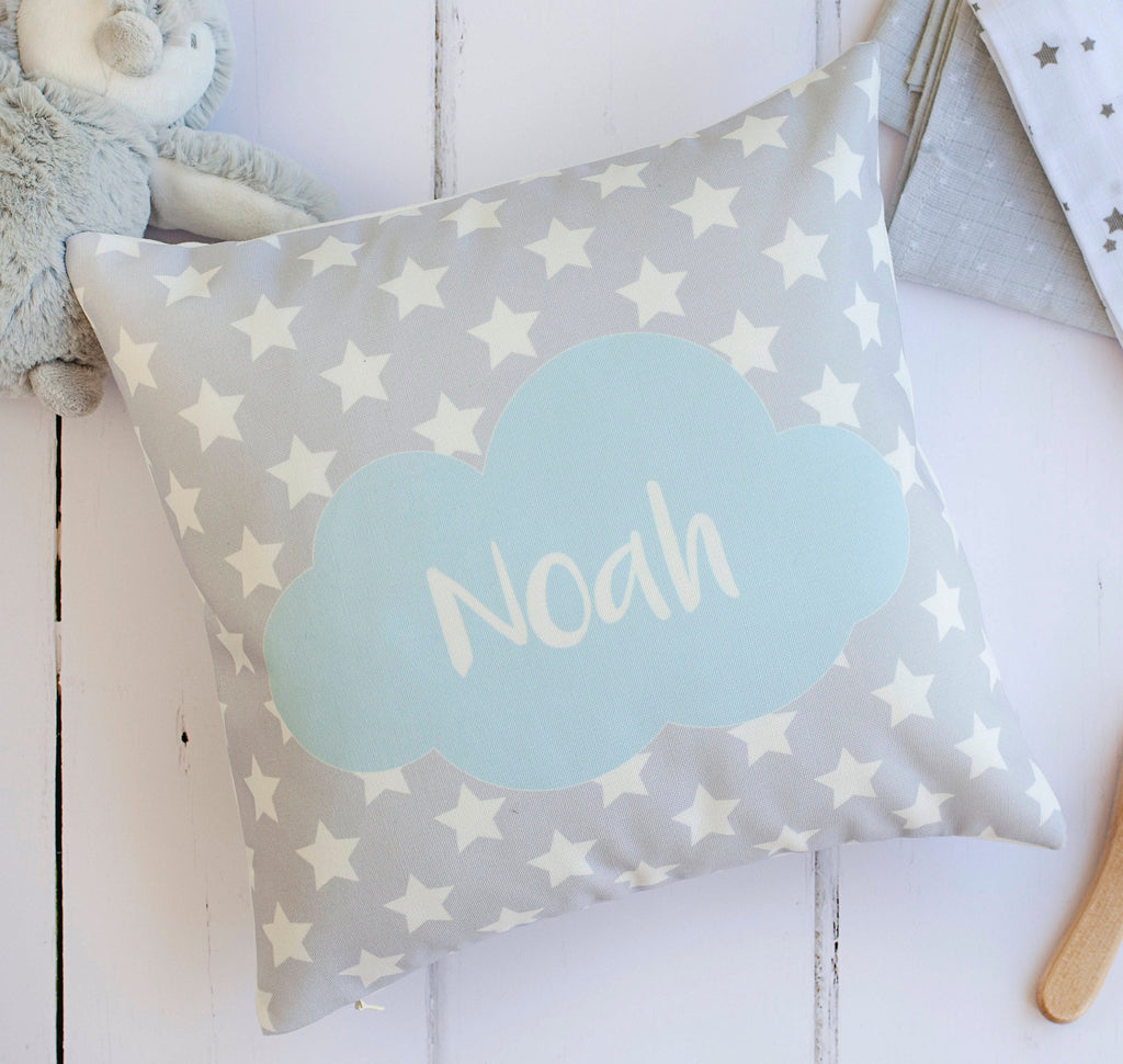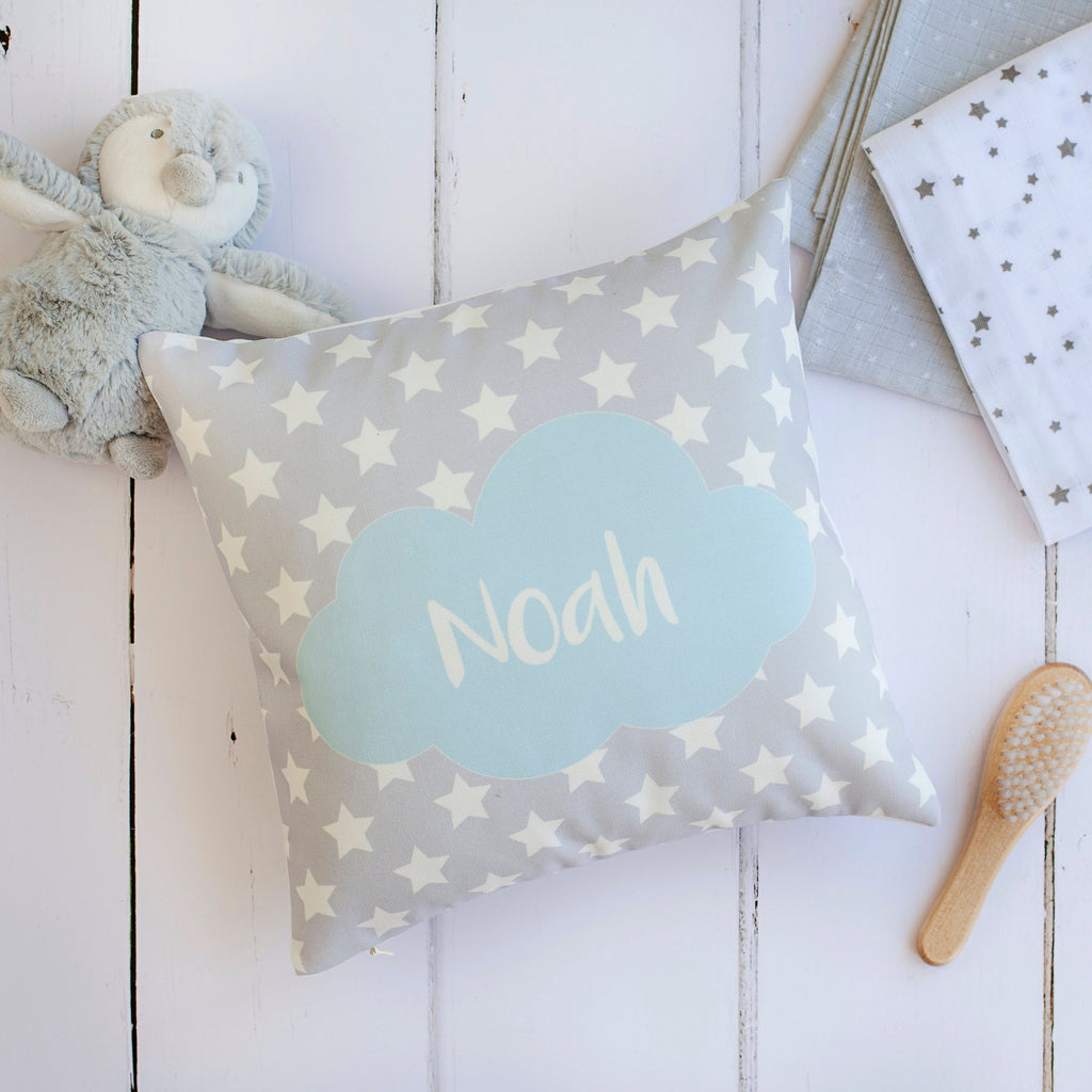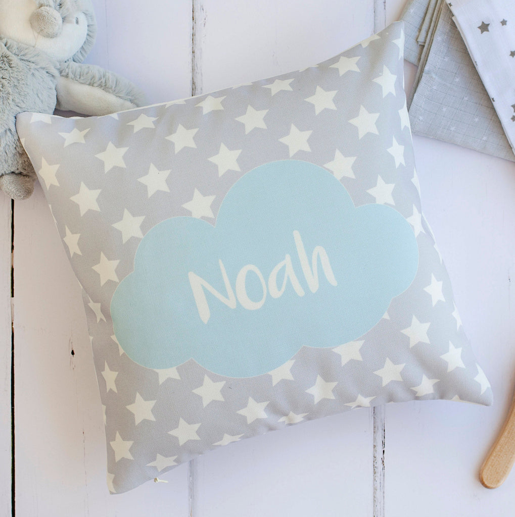 The high-quality cushion features a blue cloud, with a bold name in white, on a background of white stars.