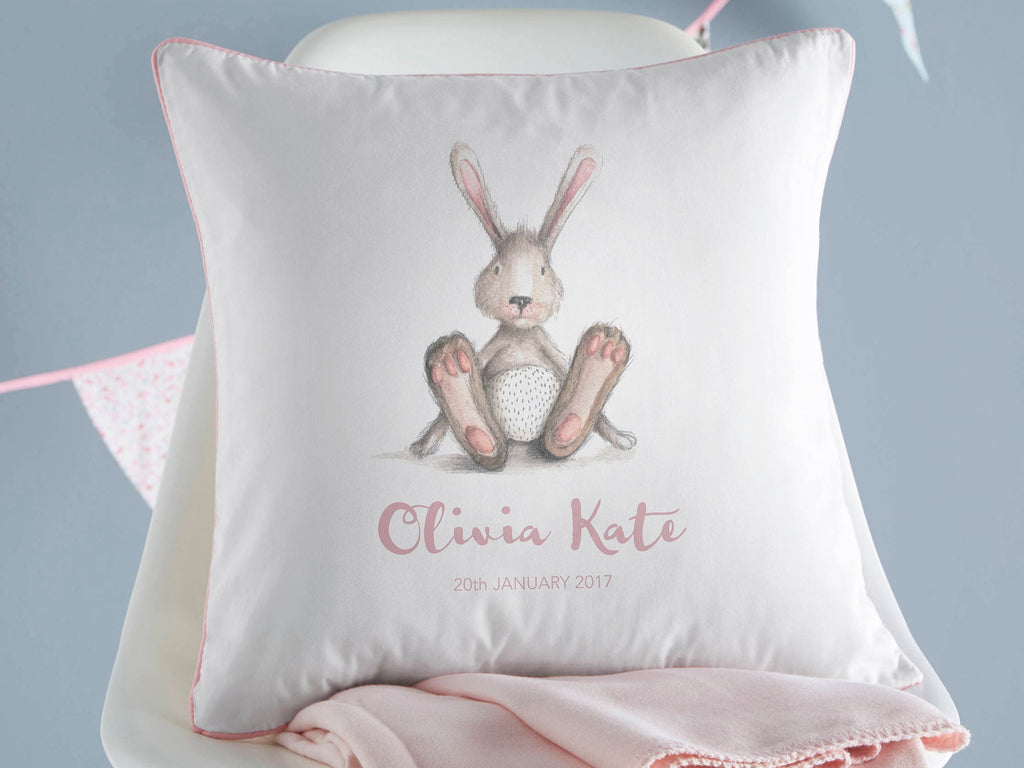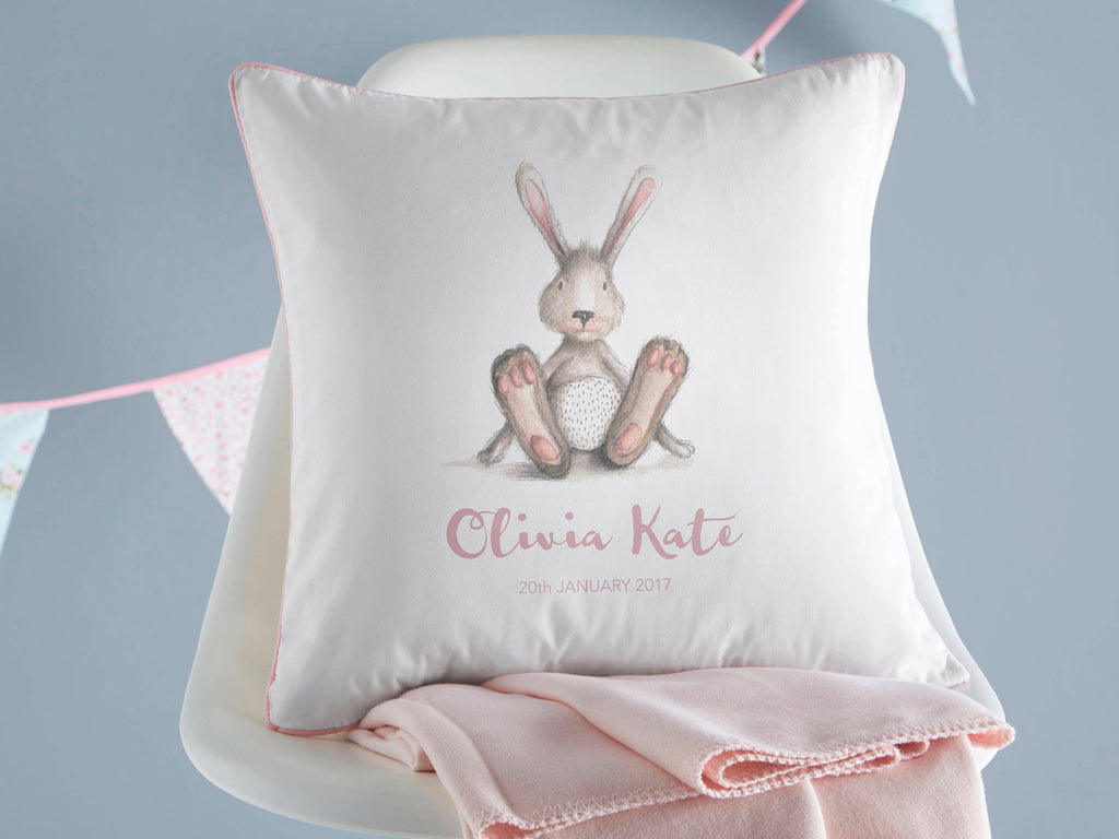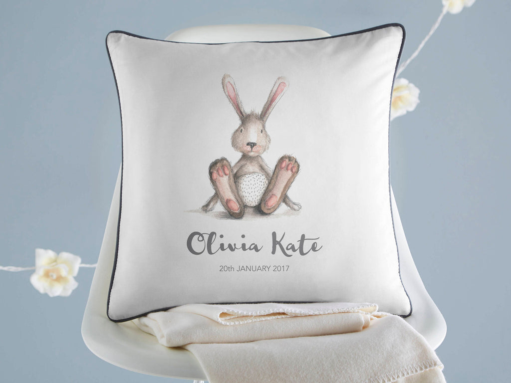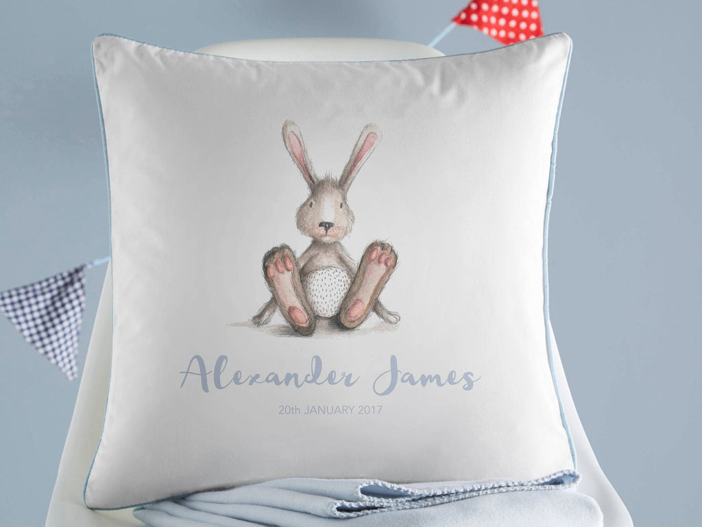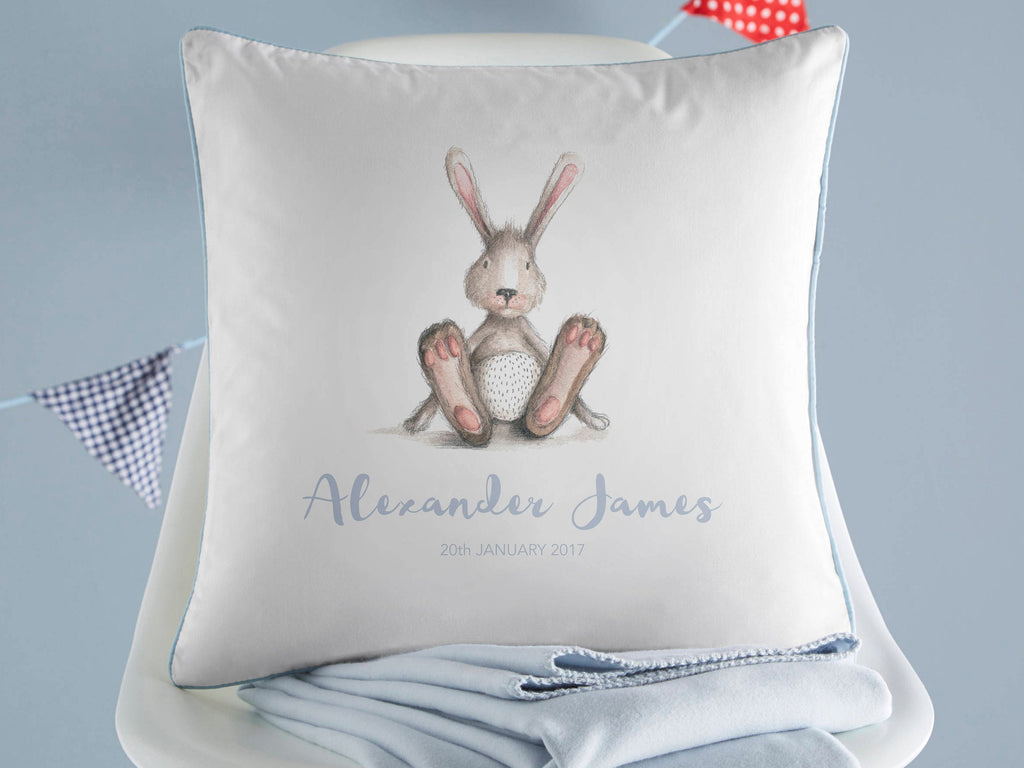 Available in both baby boy and baby girl designs or even a neutral grey colour, this personalised new baby bunny cushion makes a thoughtful gift for friends and loved ones.