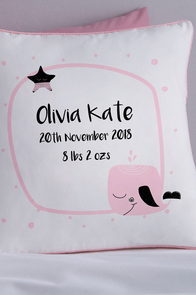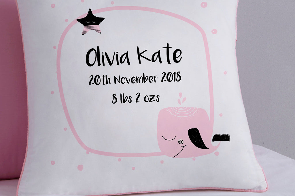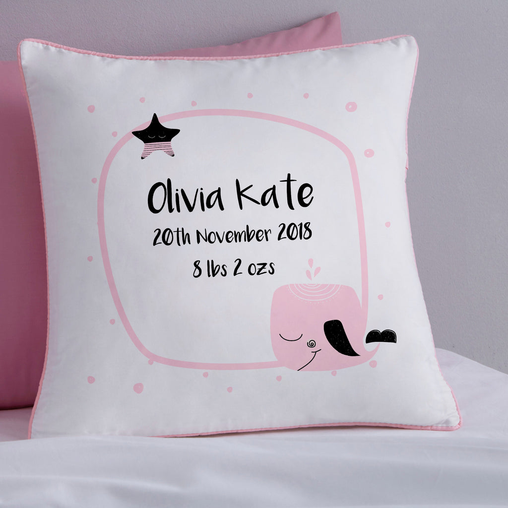 Say 'Welcome to the World' with this cute personalised new baby whale cushion in pink.