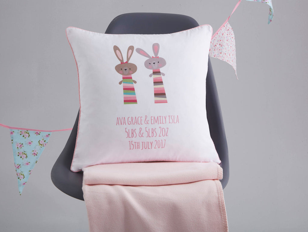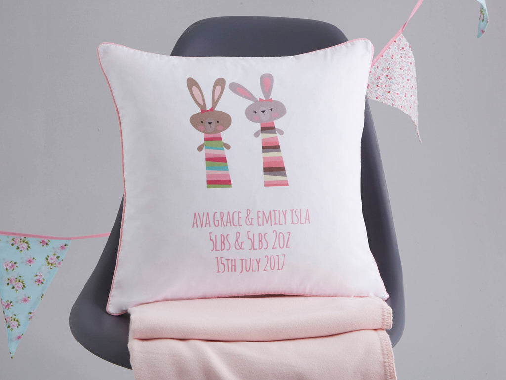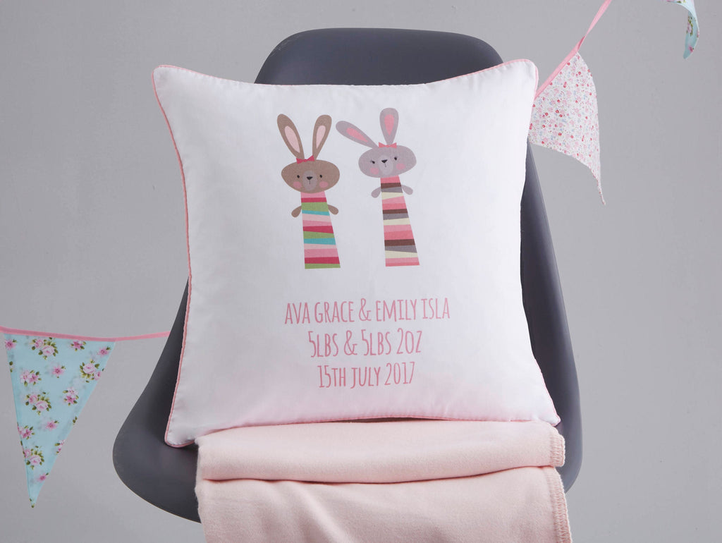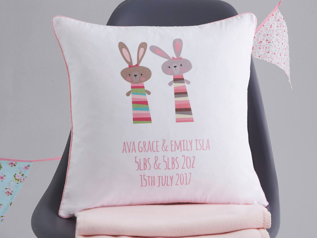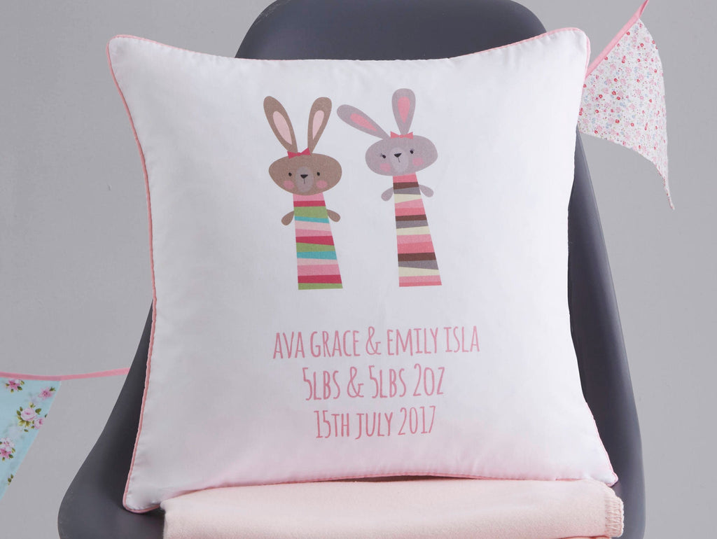 This personalised new baby bunny cushion makes a thoughtful gift for friends and loved ones.