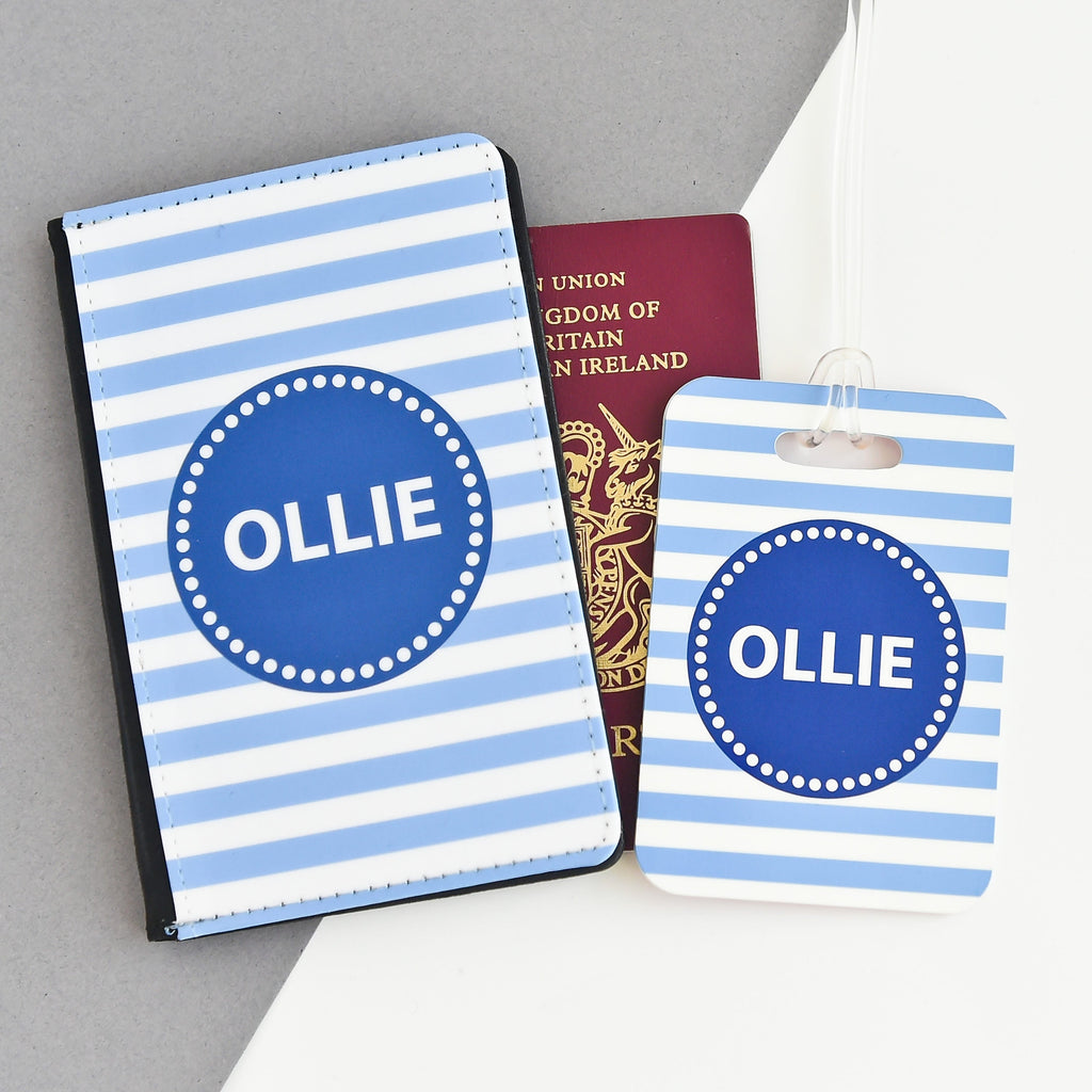 This striking blue striped personalised passport cover makes a great gift for children and teenagers. Boys will love this super cute striped cover complete with a circle containing their name.