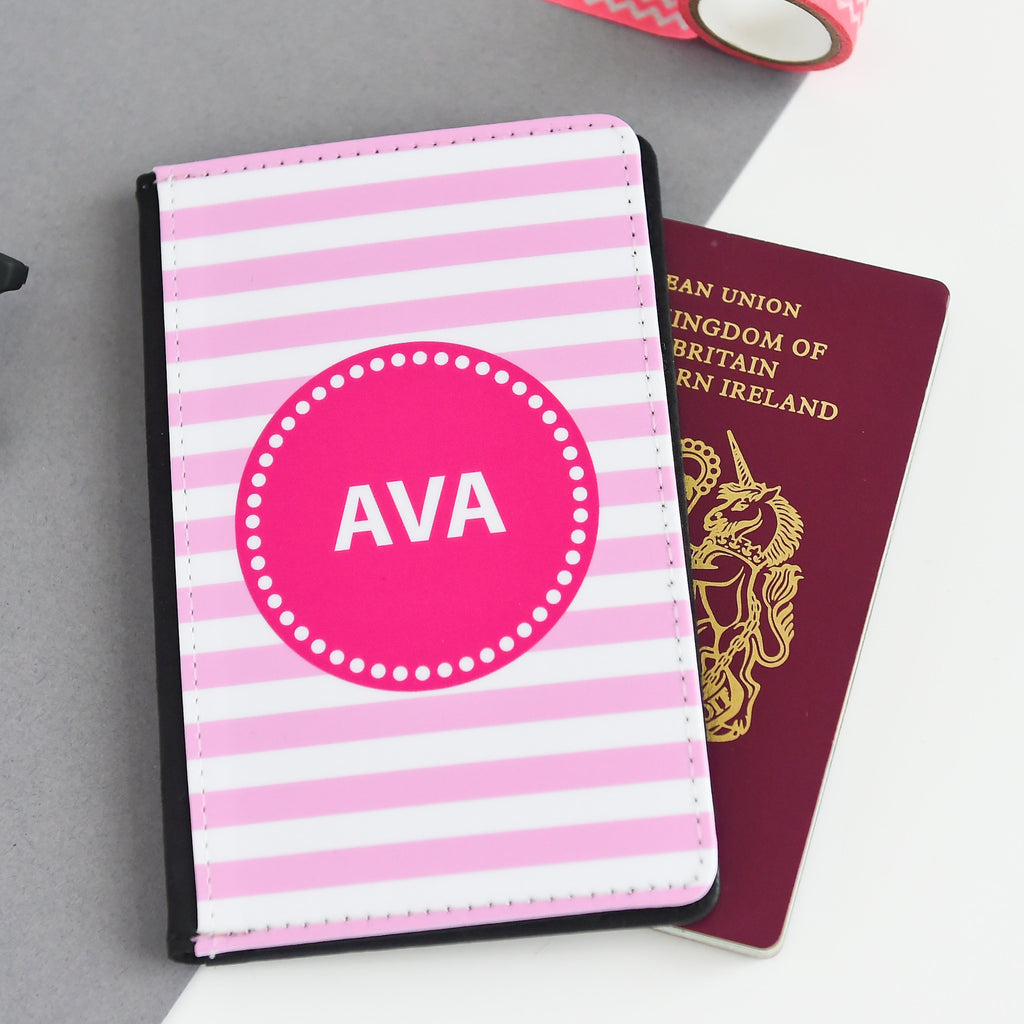 This striking pink striped personalised passport cover makes a great gift for children and teenagers. Girls will love this super cute striped cover complete with a circle containing their name.