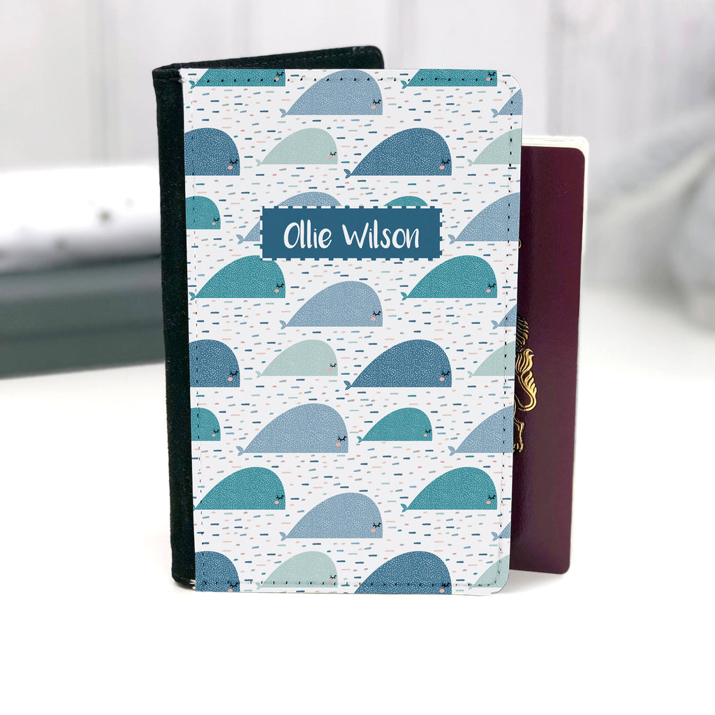 This passport cover features a cute whale pattern along with the baby or child's name.