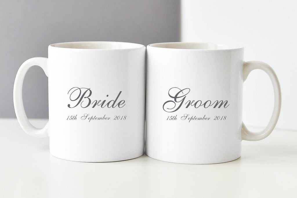 The pair of mugs state, 'Bride' on one mug and 'Groom' on the other. The modern font is printed on to a white enamel base.