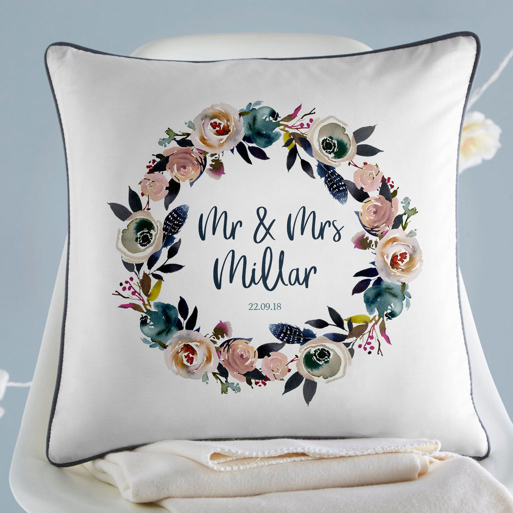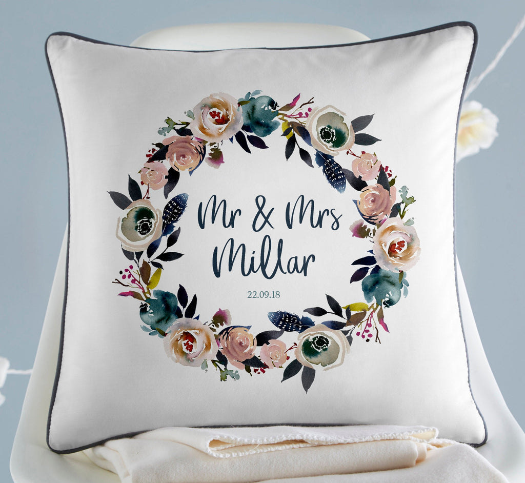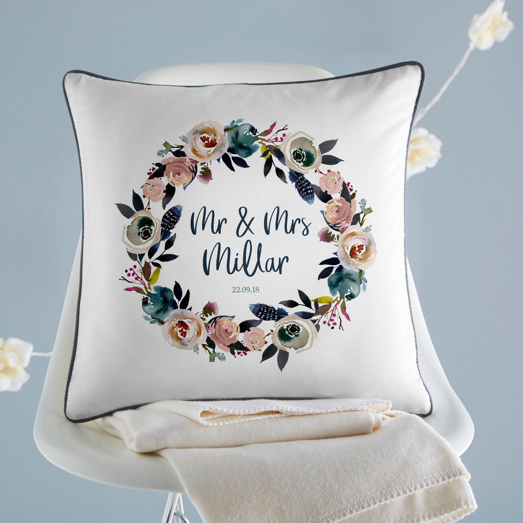 This personalised wedding cushion makes the perfect wedding gift or anniversary gift. Printed on a white 100% cotton base, the pretty floral wreath frames the name of the happy couple and the date they got married.