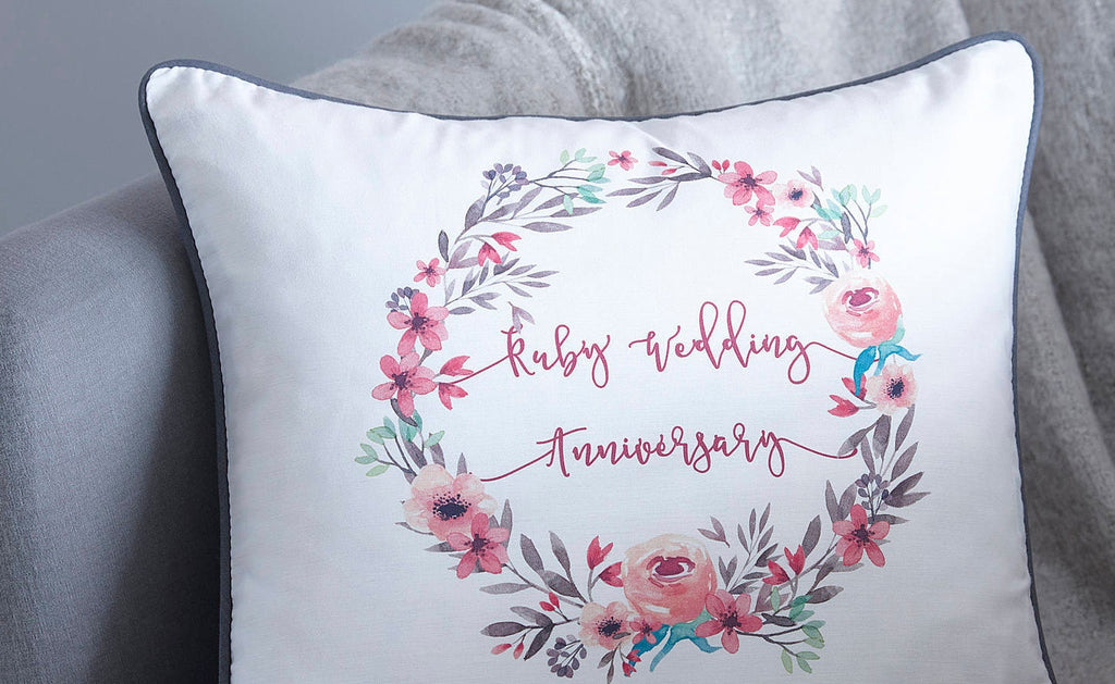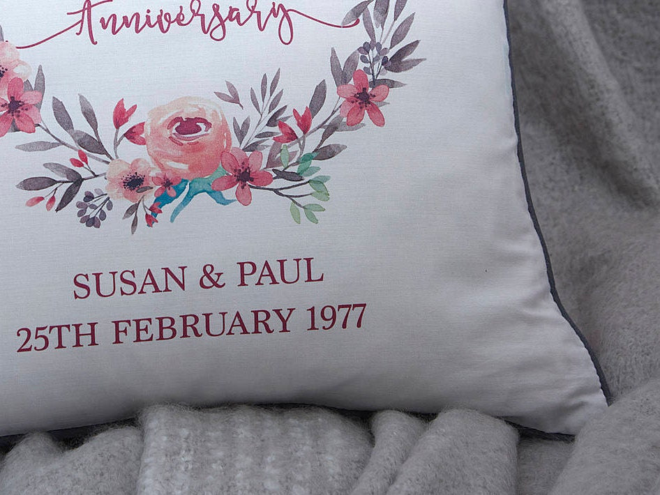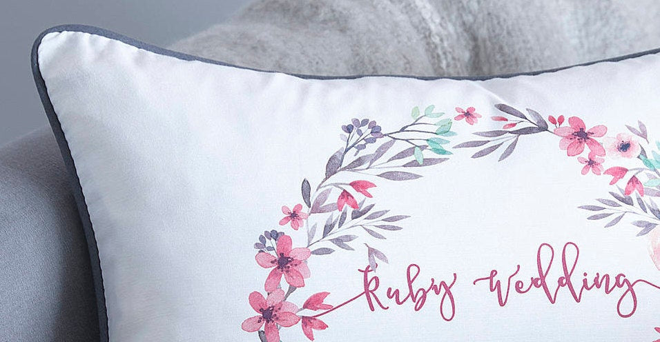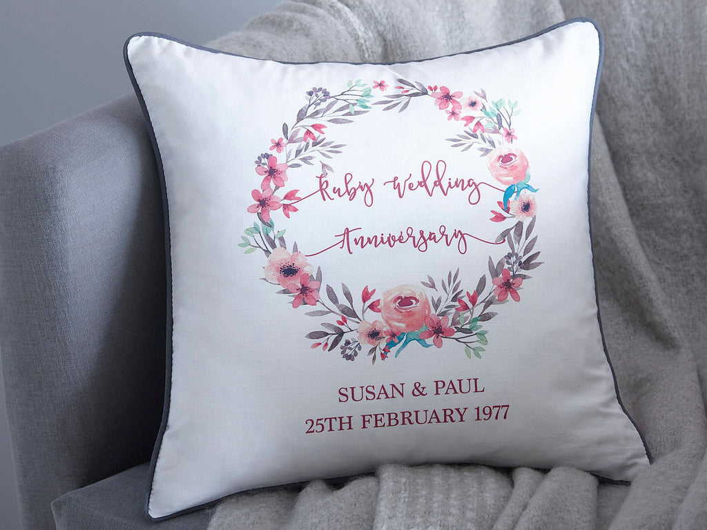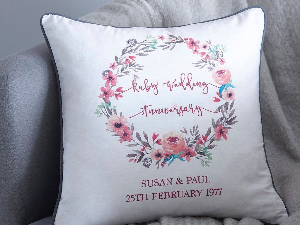 This personalised Ruby Wedding Anniversary cushion makes the perfect thoughtful gift. Printed on a white 100% cotton base, the pretty floral wreath frames shows the name of the anniversary and below is the name of the happy couple and the date they got married.